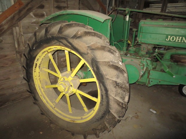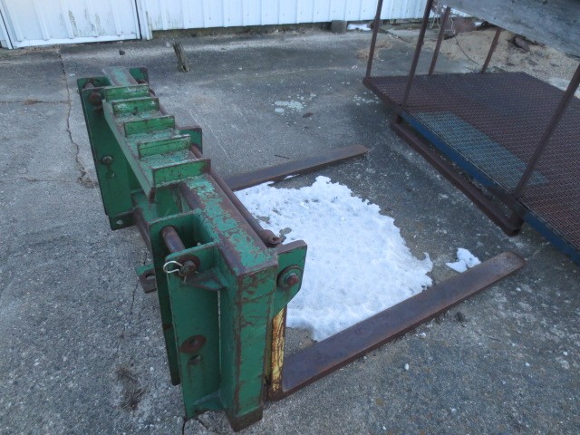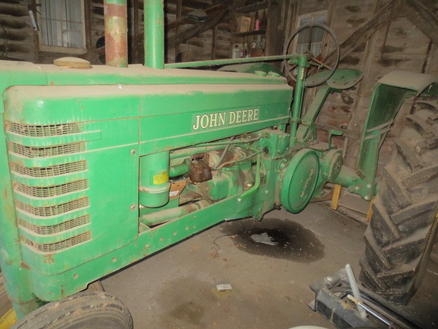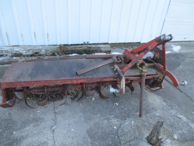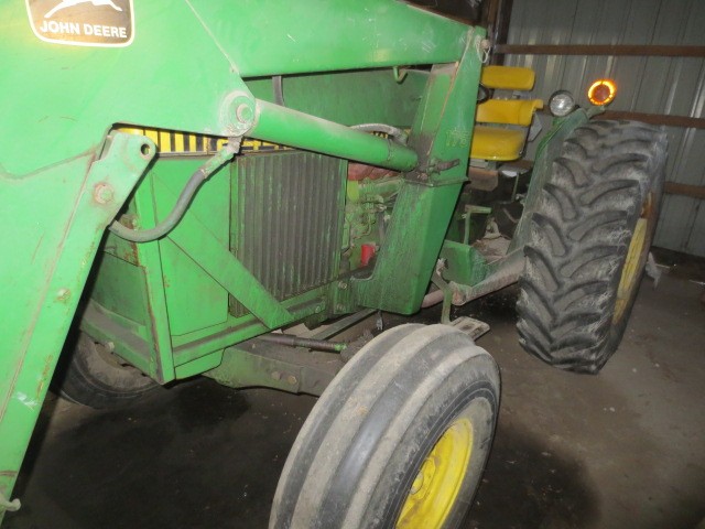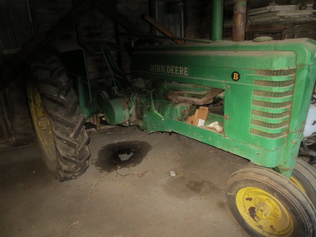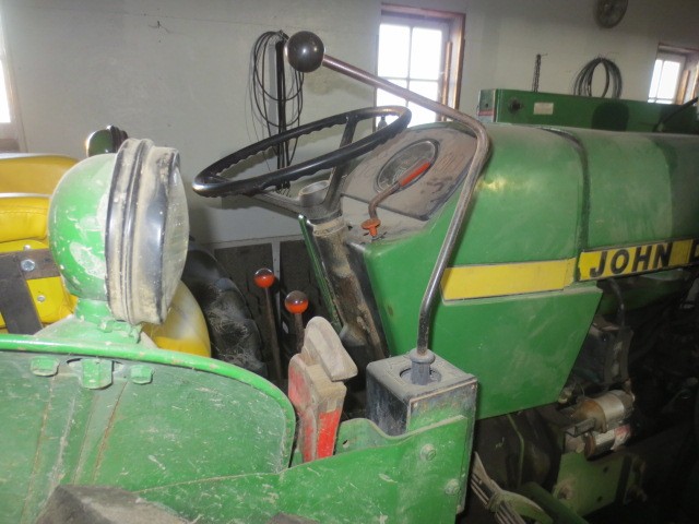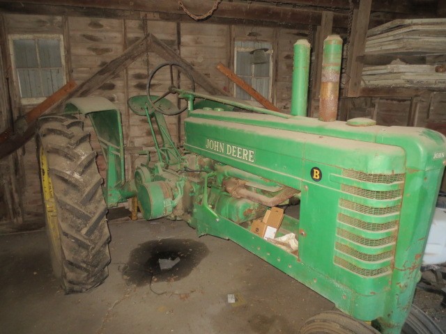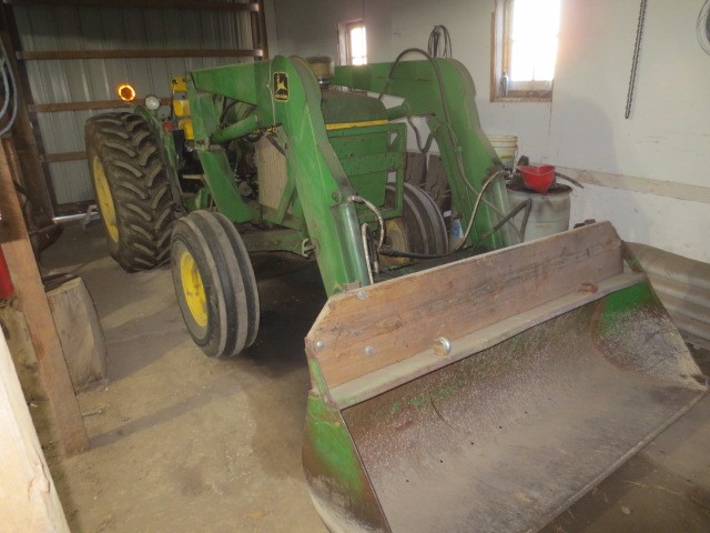 Tractors & Equip: JD 2440 Diesel SN. 347621-T w/ 175 loader, 1939 B JD-spoke wheels- fenders, set rear chains for 2440, 3pt box scraper, 3pt bale mover, older Befco 3pt pto rototiller, 2 wheel trailer w/ drop ramp.