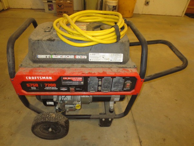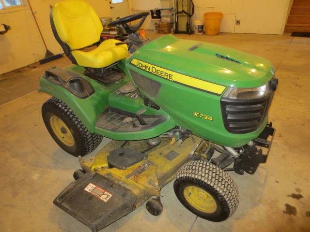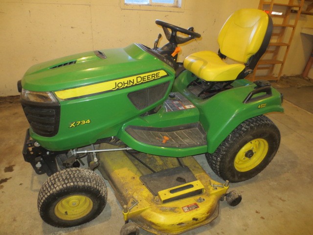 Mower & Related: JD X734 4 wheel steer 62” deck 2016 w/ only 420 hrs, Fimco pull 12 volt lawn sprayer w/ boom, Craftsman generator 5750 watts-7200 starting watts, lawn bench, lawn tools, 2 steel lawn chairs, echo chainsaw, MasterBuilt smoker.