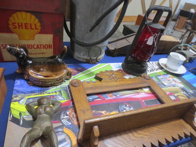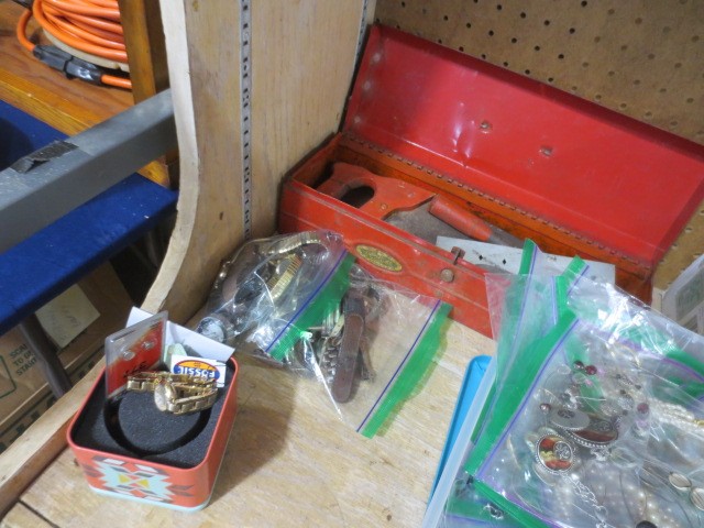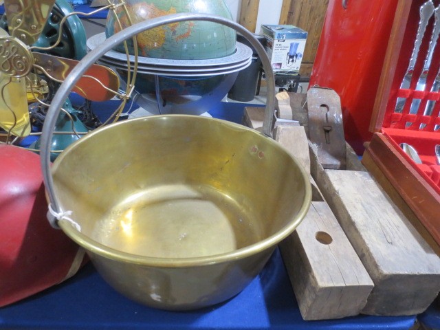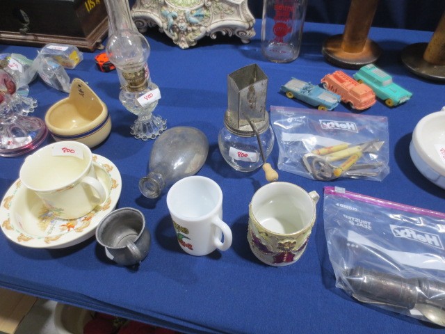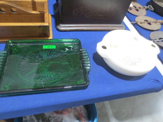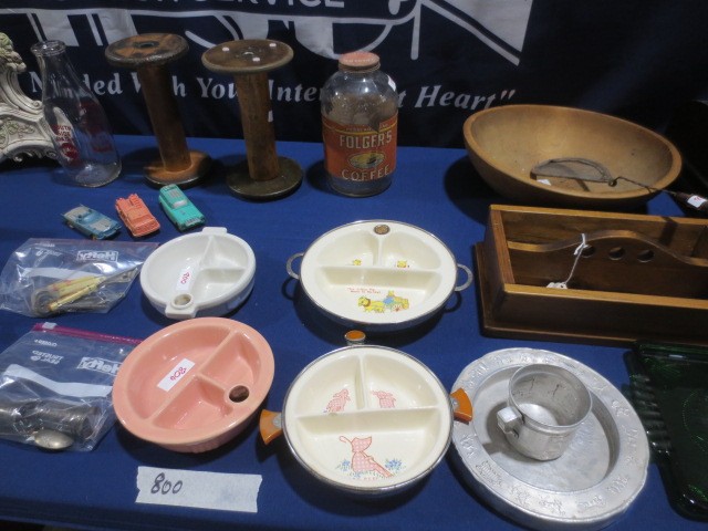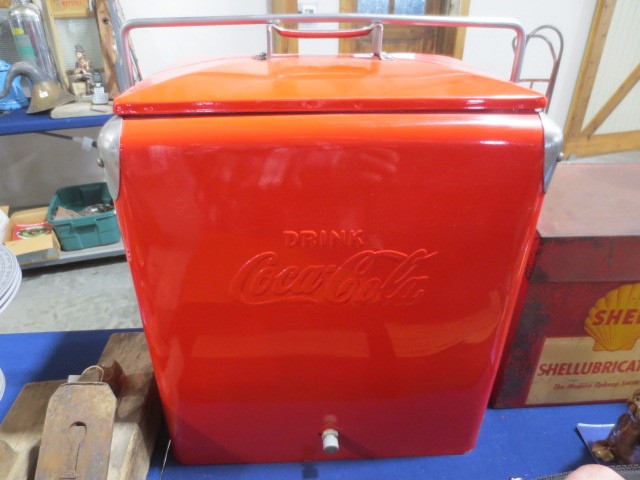 Collectibles: Edison cylinder player, scales, Many Griswold CI Pcs NO 14 Skillet, 5,6,8,9,10 – many other pcs., Graniteware, huge wooden bowl, many glass ice buckets, crocks, many marble games, Apollo Mission emblems display, marbles, old wooden horse rockers, Coca-Cola cooler, Aladdin lamp, Shell-Shellubrication Tin pc., GE 4 blade brass fan, A-A Alert helmet, lanterns, Budweiser Cooler, Crescent-Tom Thumbs Cracker Tin, Jewelry, Painted wood, US flag, AMF Roadmaster Skyrider bike, silver ring, #2 gold tone wedding bands, some other jewelry, wood trunks, wood plains, hand saws, much more!